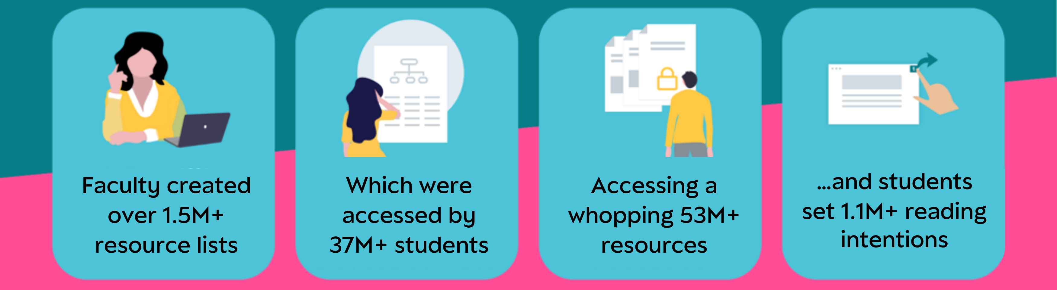 Faculty and other list creators at institutions created over 1.5 million resource lists on Talis Aspire in 2023 alone – that’s a lot of reading! These lists were accessed by over 37 million students, connecting them with over 53 million learning resources. Furthermore, students set 1.1 million reading intentions on the Talis Aspire platforms, helping hone their academic reading and study skills.