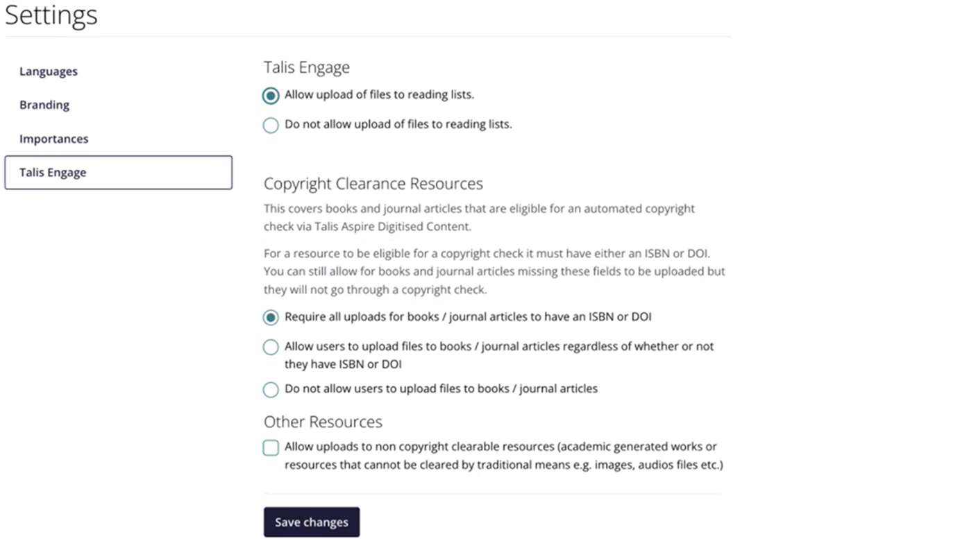 All the while, Talis Engage keeps the library at the heart, with options for librarians to require copyright checks on resources that faculty upload, and usage insights into student engagement and commenting available in Talis Advanced MIS.