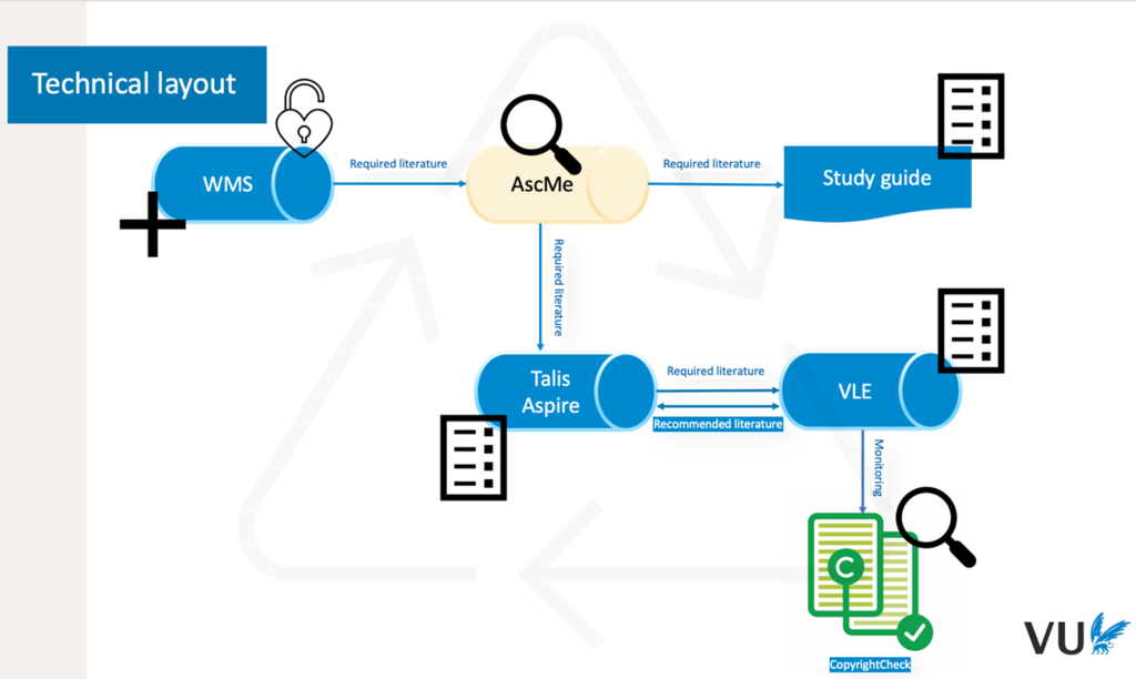 This process of gathering the necessary information makes up their educational program, VU refers to as the Academic Structure & Content Modelling Environment (AscMe). Together with the supplier (TimeEdit) the VU is working to expand opportunities of AscMe on providing literature-information. With the goal being that when a program director adds literature to AscMe, it will be -via Talis Aspire- directly integrated with VU’s LMS. This will mean that lecturers and students will always have the right information available on reading lists. With this landscape in place, VU will get greater usage insights and a nice overview of the required literature being used in education. This bridges the gap between lecturers and students when it comes to considering the right content, together with reducing copyright infringements.